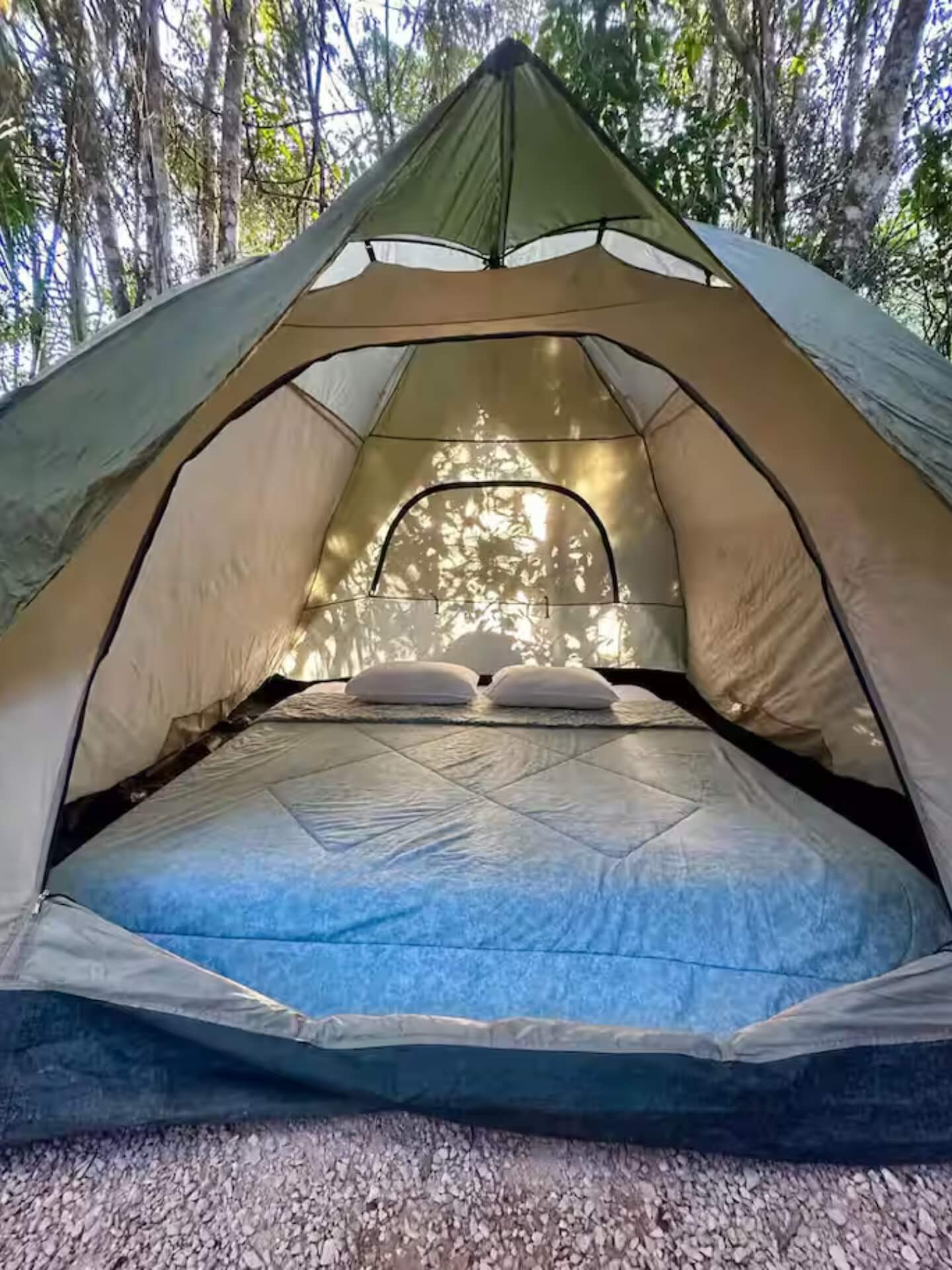 Barracas Prontas e Privativas: Áreas delimitadas com barracas já montadas, novas e equipadas com colchão D33, travesseiros e roupas de cama de primeira linha.